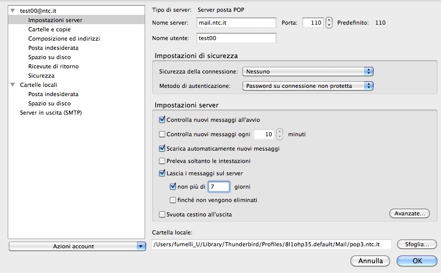 NB: Questa configurazione rende più probabile la saturazione della casella, visto che la posta rimane sul server per più giorni. Pertanto è decisamente sconsigliata se ricevete abitualmente messaggi con allegati molto grandi (file grafici, foto e simili). In ogni caso si consiglia di non eccedere mai il valore di 5 o 7 giorni per la conservazione della posta sul server.